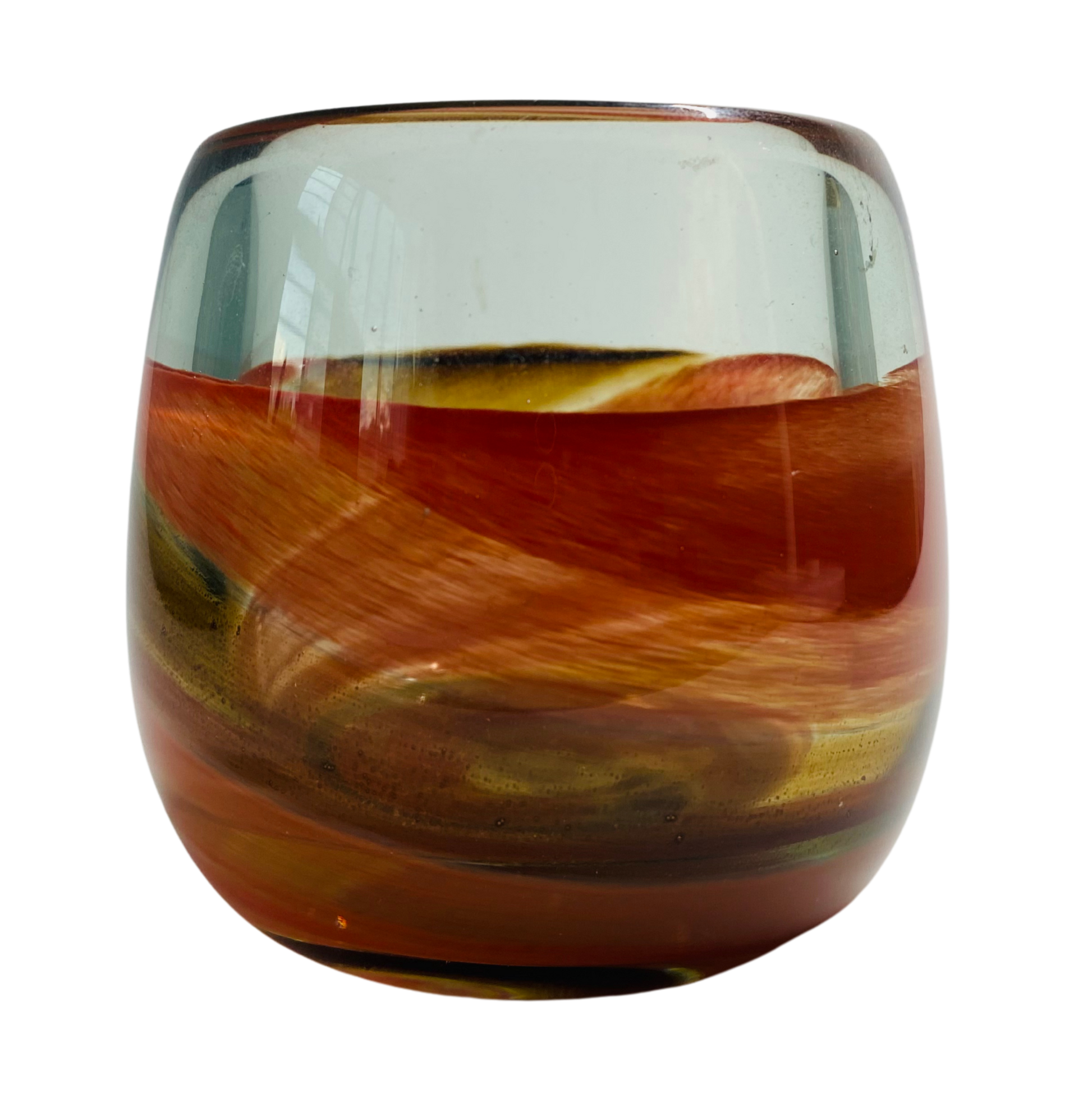 Bring warmth and elegance to your space with this stunning hand-blown glass tea light holder, inspired by the fiery hues of a breathtaking sunset. Featuring a mesmerizing blend of amber, deep red, and golden swirls, this piece captures the essence of the sun dipping below the horizon, casting a radiant and soothing glow.